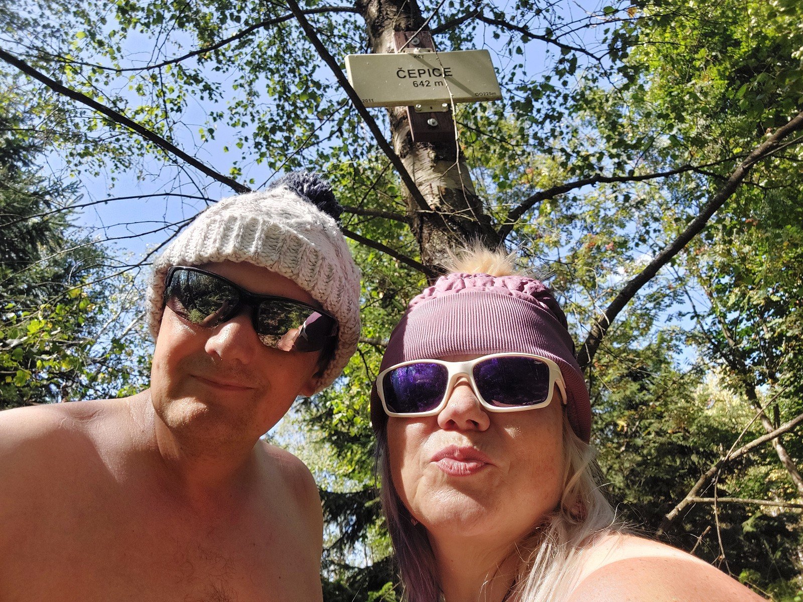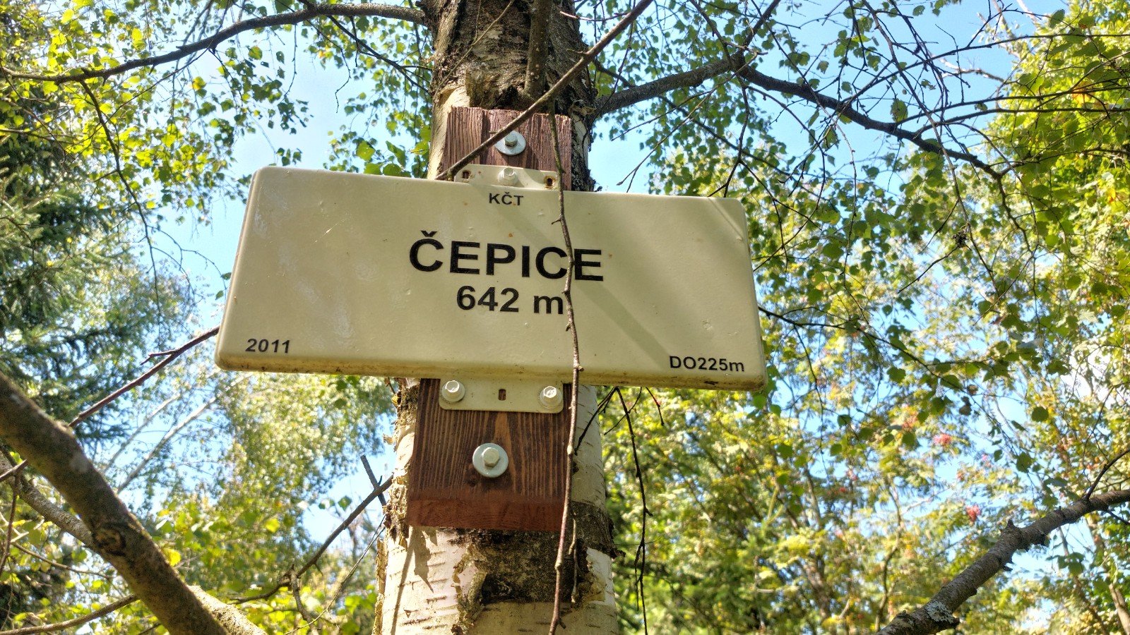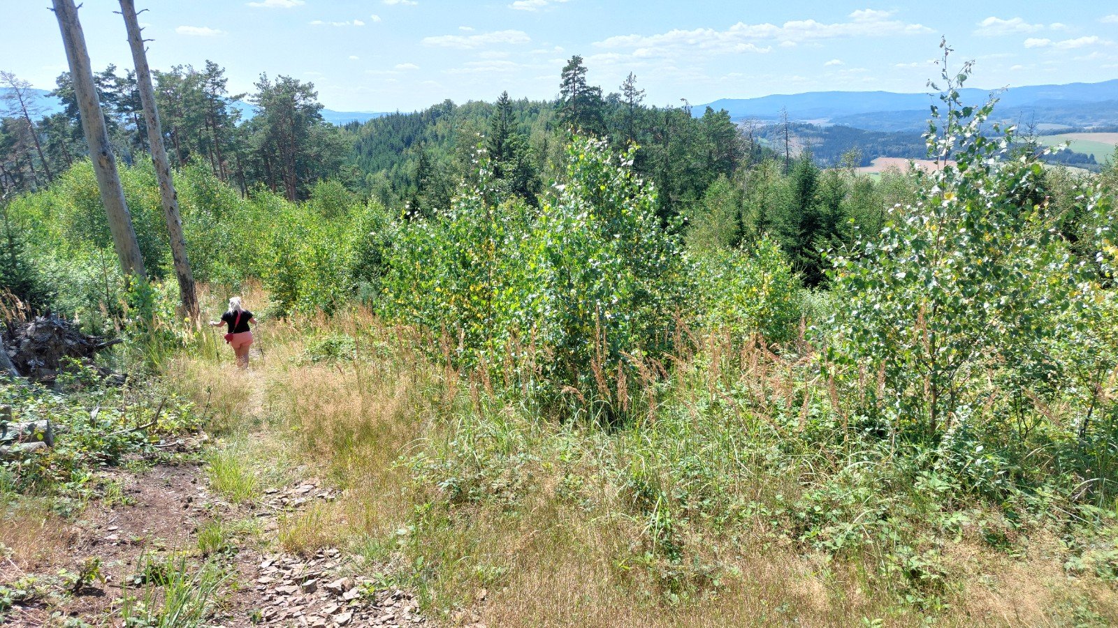 Vrcholová cedule je přestěhovaná blíž na značku. Z Bezného zarostlejší na rozcestí, pak už příjemná cesta