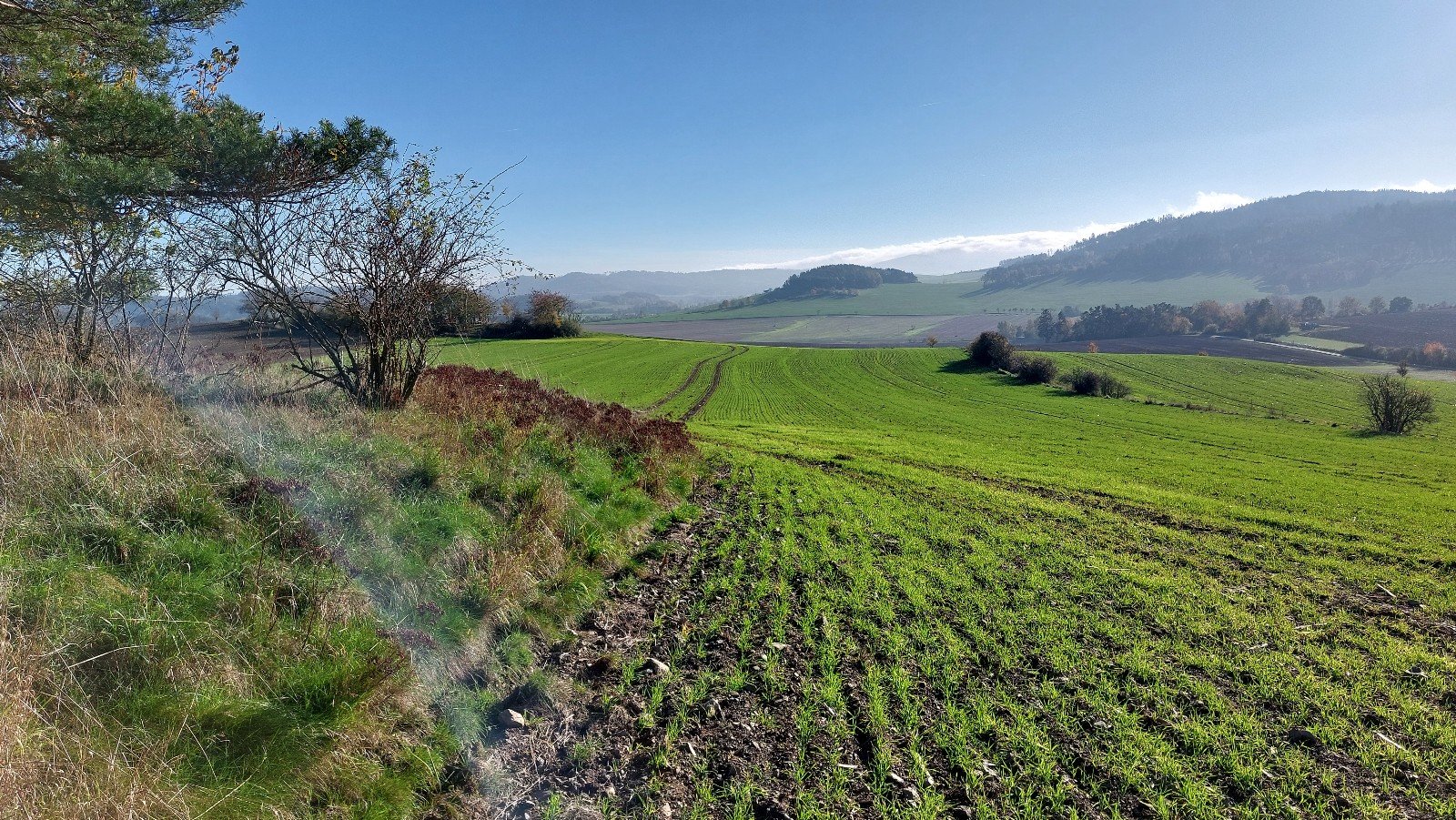 Přes suché a už sklizené pole. Překvapil mě podivuhodný výhled z kraje lesíku