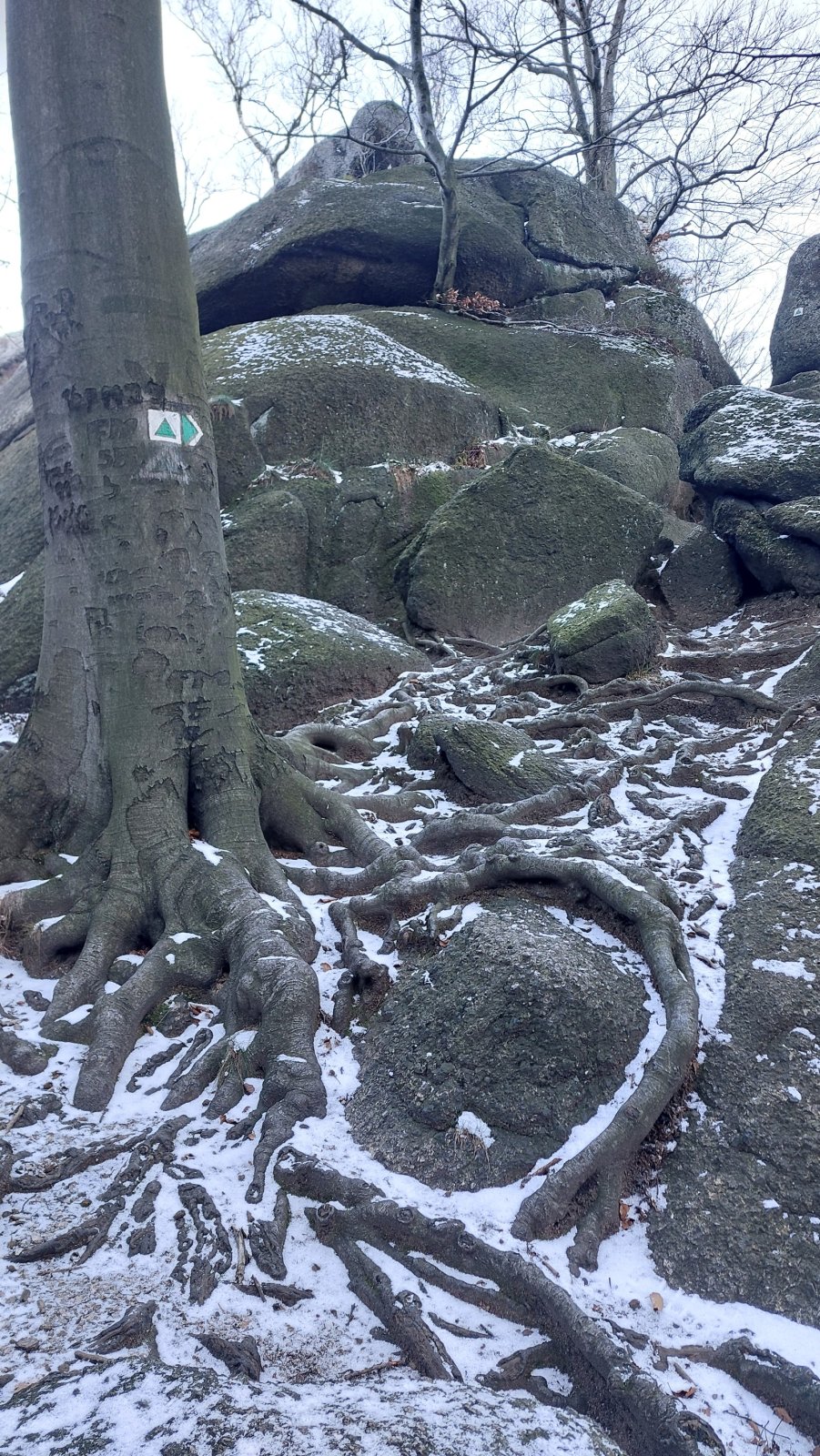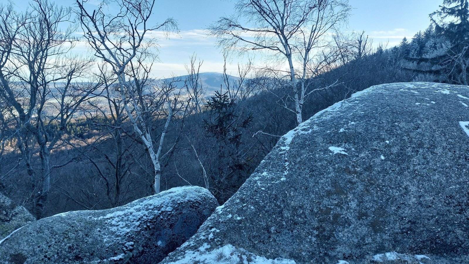 Skalní Hrad-Oldřichov-Poledník-Olivetská hora-Liberec, 31km - od Gorily přehoupnout se přes Lysé skály a pak zase hodně dolů. Ale odměna v podobě výhledu ze Skalního hradu za to stála 👌. Mrazivo, teď v půl desáté ještě -7C a slunce se sem ještě pořd nedostalo