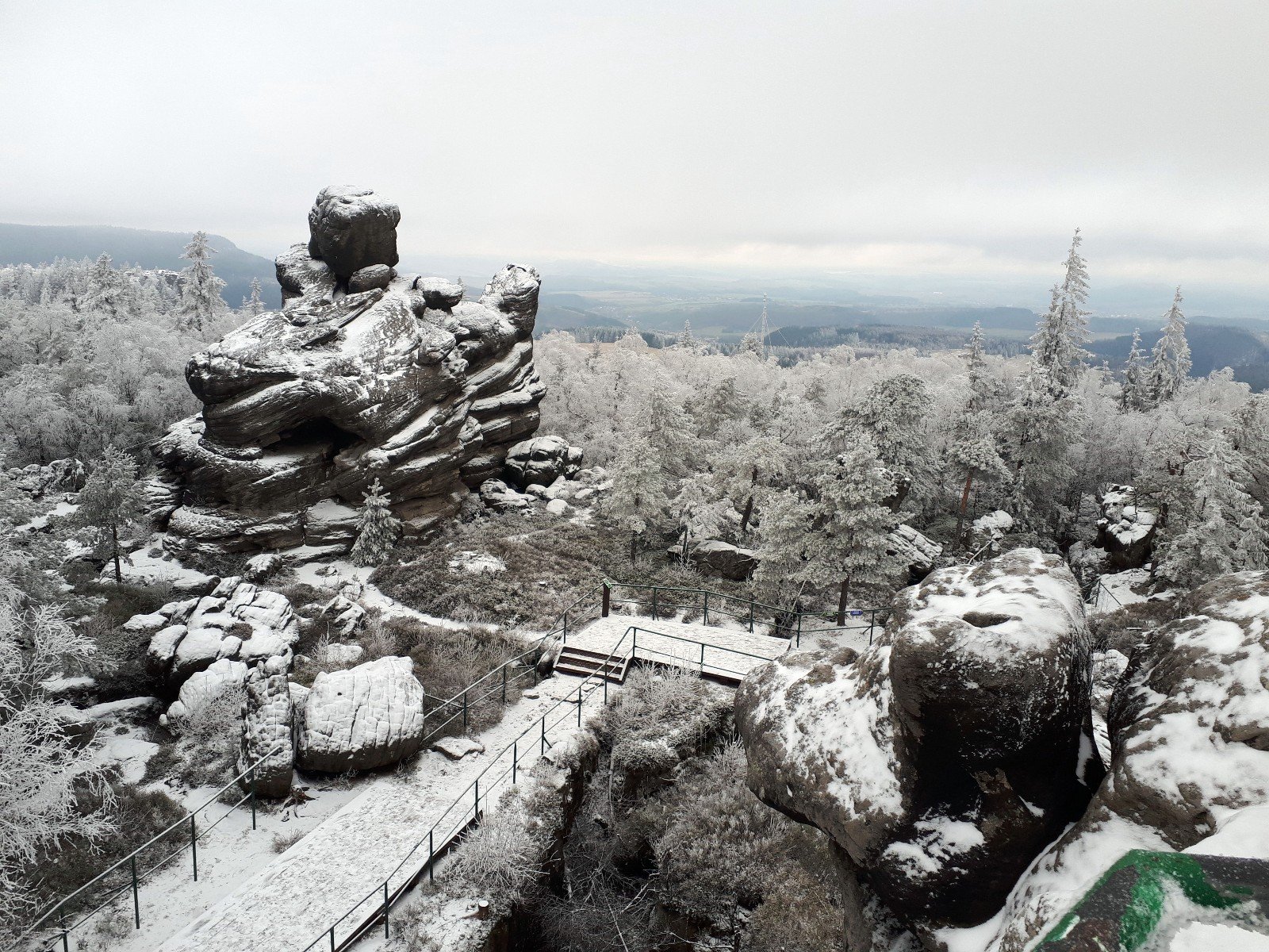 Z Machova od restaurace U Lidmanů (jabloň na zahradě je Strom roku 2020) po modré do Karlówa, dále po zelené, dá se zkrátit lesní cestou na souběžnou modrou pod Malou Hejšovinou (Szczeliniec Maly), poslední úsek od rozcestníku vede po dlouhých kamenných schodech. V létě je vstup placený, v prosinci volný, chata na vrcholu byla otevřená.