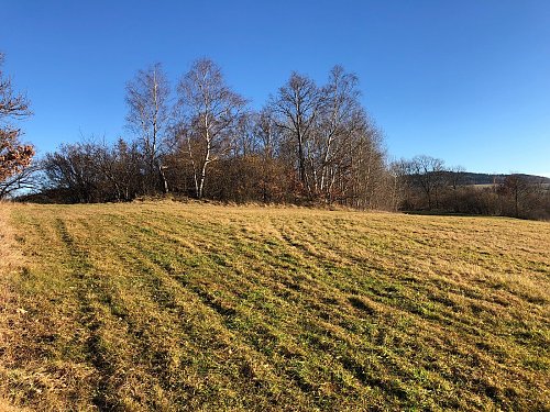 Vrchol s geodetickou tyčí a patníkem je v porostu, ale z louky jsou krásné výhledy.
