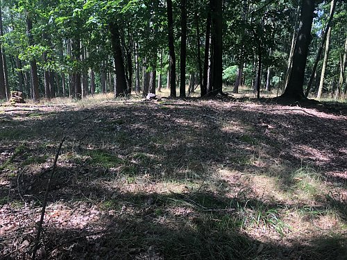 Plochý zalesněný vrchol, bez výhledu.