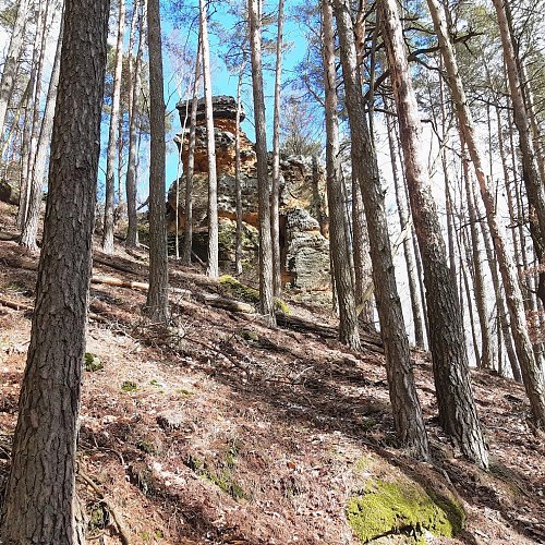 Mohutná pískovcová skála v jihovýchodní části vrcholového hřbetu Ostrého kopce, ještě vyšší než samotný Ostrý kopec.