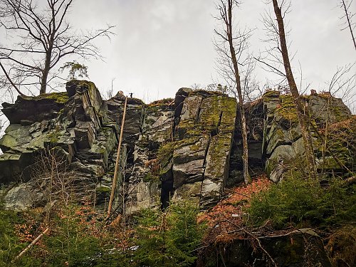 Skalní stěna, která vyniká při pohledu ze severu. Snadný přístup je z jihu.