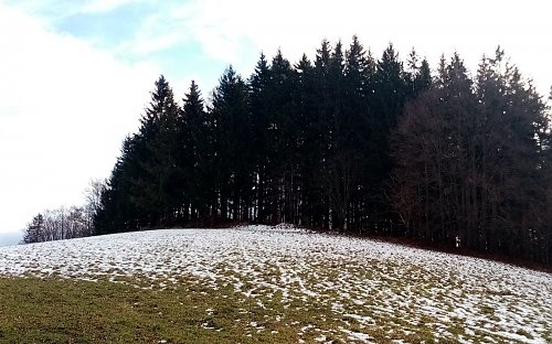 Vrchol leží na okraji lesíku a je označen tyčí i patníčkem